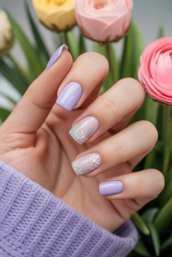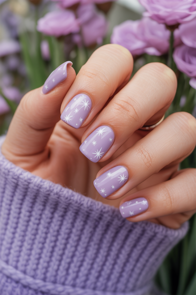 This design combines soft lavender polish with small white stars. The stars add a delicate detail without overwhelming the look. It fits well with spring’s light and fresh vibe.