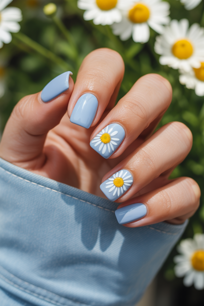Light blue polish creates a calm, fresh base for square nails. The addition of small white daisies adds a delicate, natural touch. This design suits spring with its soft, airy feel and subtle floral charm. It works well for both casual and more polished looks.
