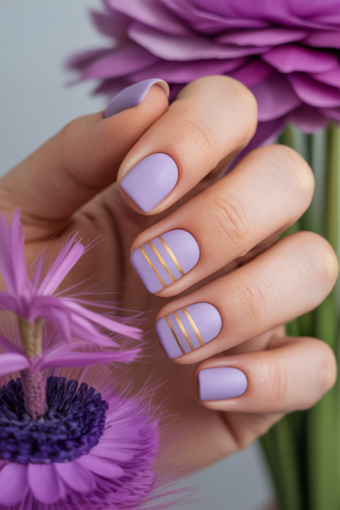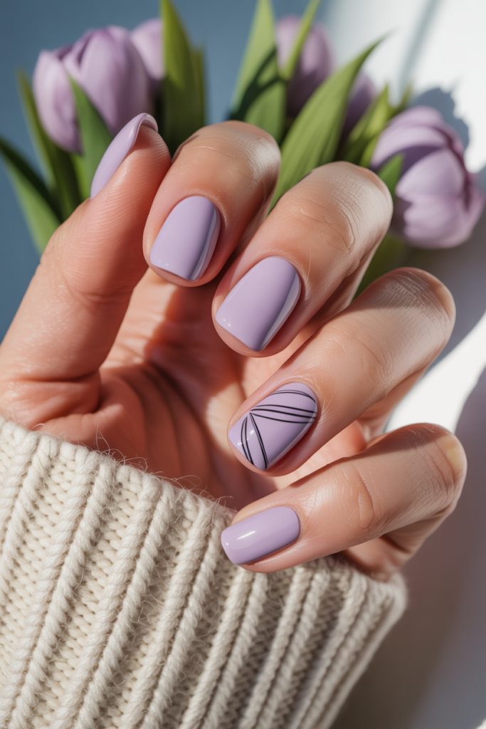 Thin lines create subtle shapes or patterns that enhance the lilac base without overwhelming it. This look works well for those who prefer elegance with a modern touch.