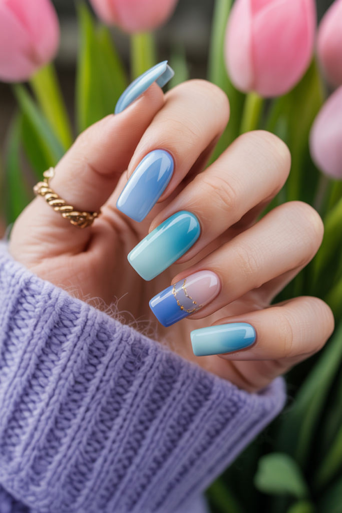 This style features long square nails with a smooth gradient of blue shades. The colors blend from light to dark, creating a gentle ombré effect. It suits many occasions and adds a calm, elegant touch to the nails.