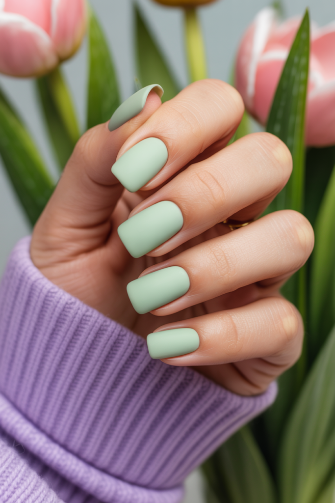 Mint green matte nails offer a fresh and modern look for spring. The soft, muted finish adds a subtle elegance without being too shiny.