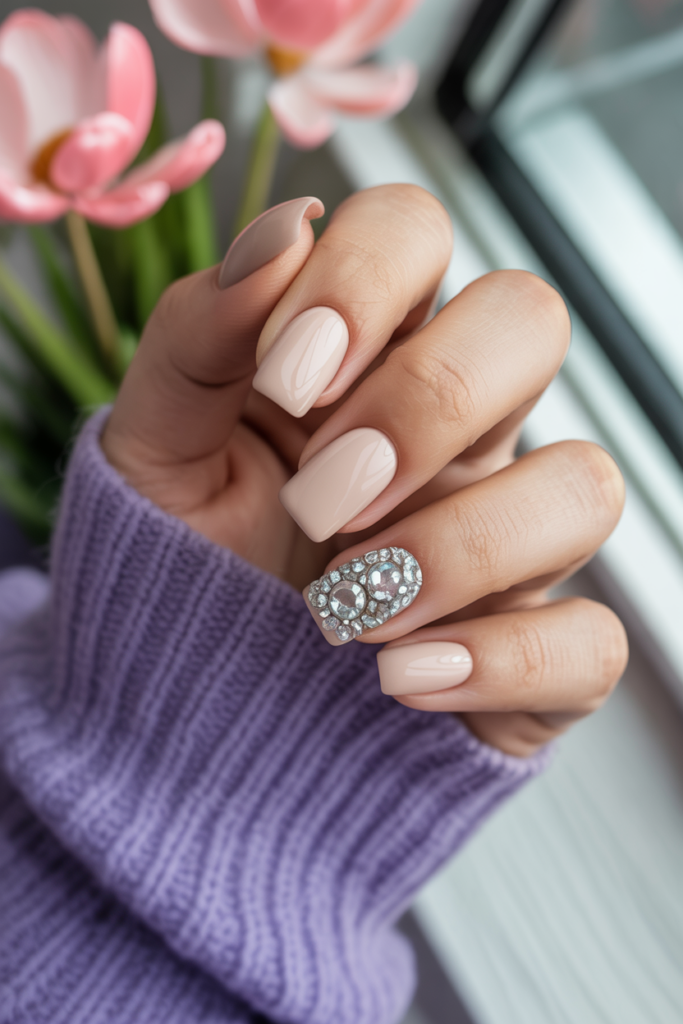 This look pairs soft nude polish with small silver crystals for a subtle sparkle. The crystals add just the right amount of shine without being too bold. It works well for both everyday wear and special occasions. The square shape keeps the style modern and neat.