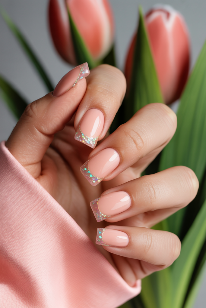 This style blends soft peachy pink with a touch of sparkle on the tips. The glitter adds subtle shine without being too bold. It works well for spring, offering a fresh, modern look that feels both elegant and fun.