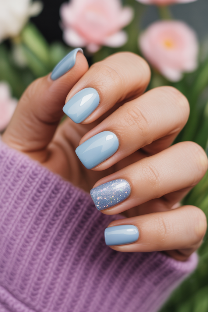 This look features baby blue polish on short, square nails. The soft pastel color is calm and fresh for spring.