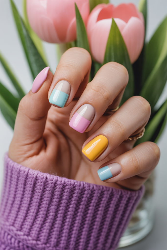 This style uses soft pastel colors in clean, geometric shapes. The color blocks create a modern look on short square nails.