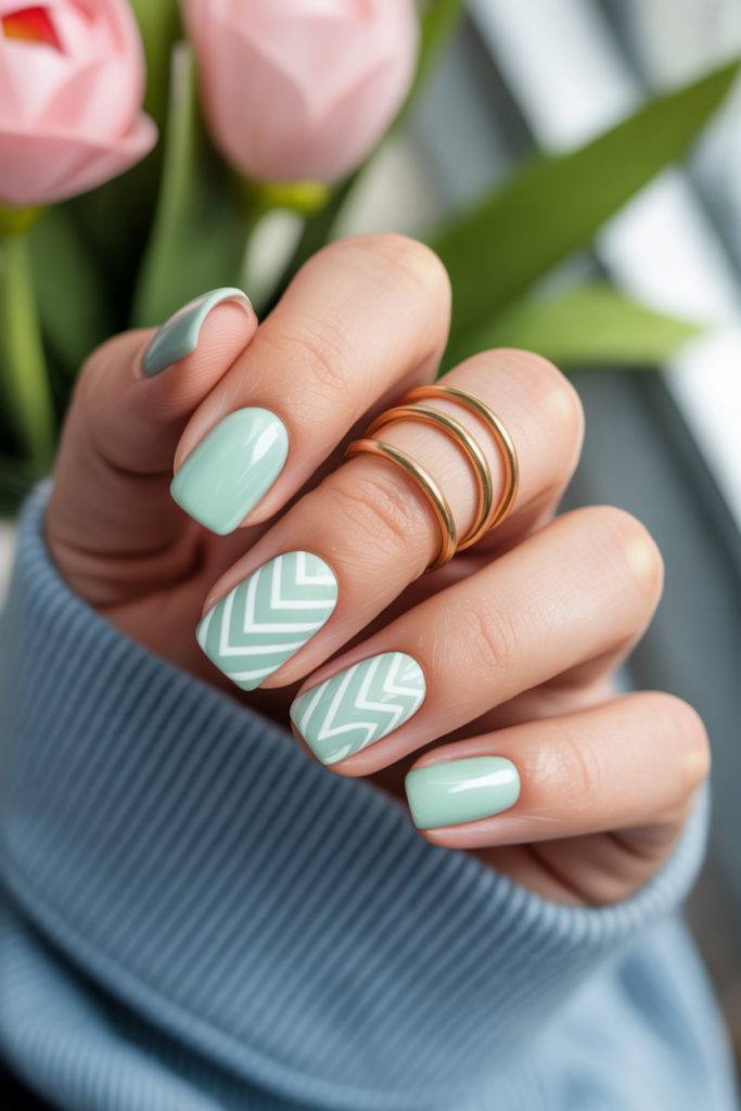 Soft mint nails offer a calm and fresh look for spring. Adding chevron patterns creates subtle texture without overpowering the design.