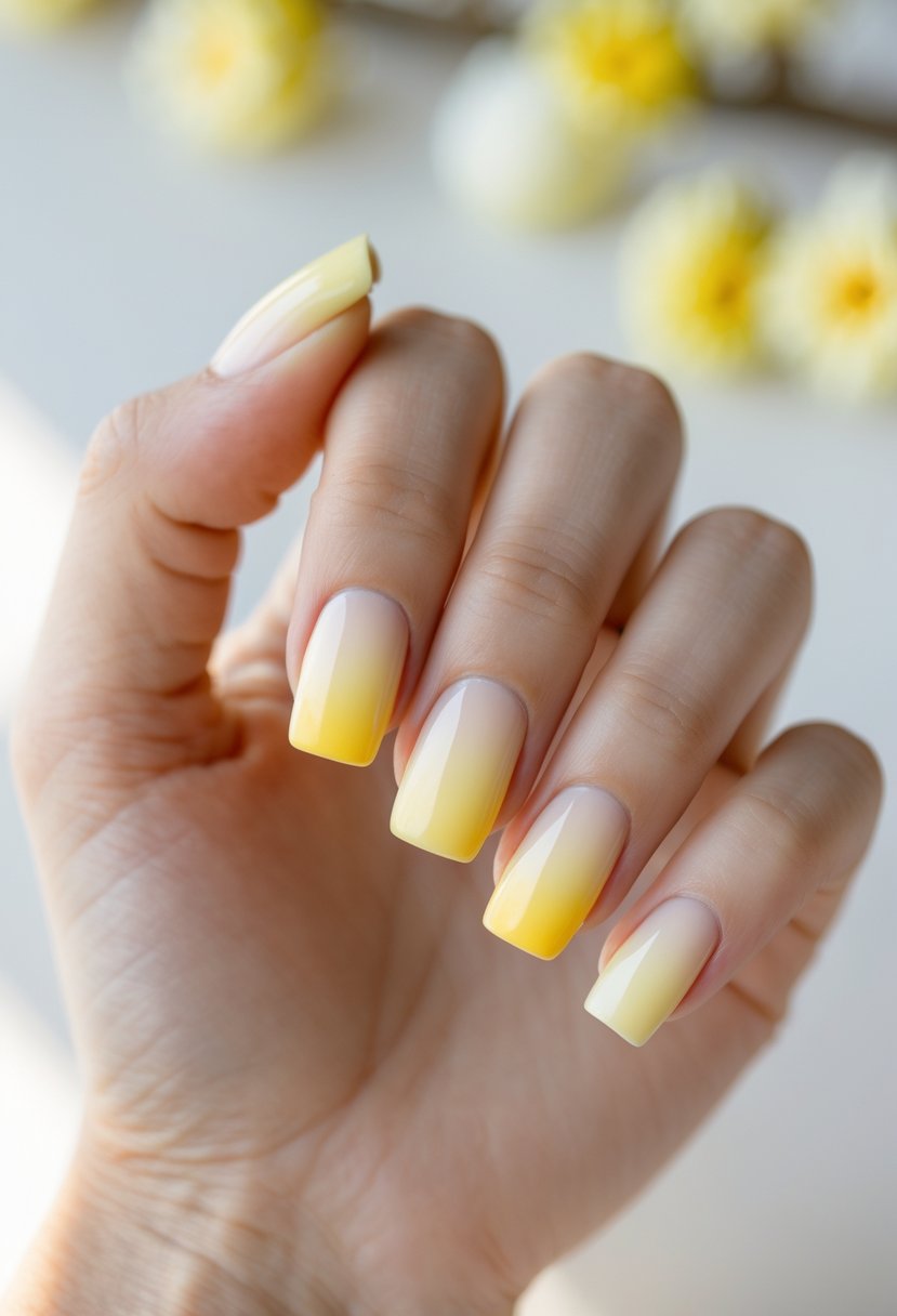 Soft yellow ombre on square nails creates a gentle, fresh look. The gradient moves smoothly from pale yellow at the base to a brighter tip. This style is simple but adds a modern touch to any spring manicure. It works well for both casual and formal occasions.