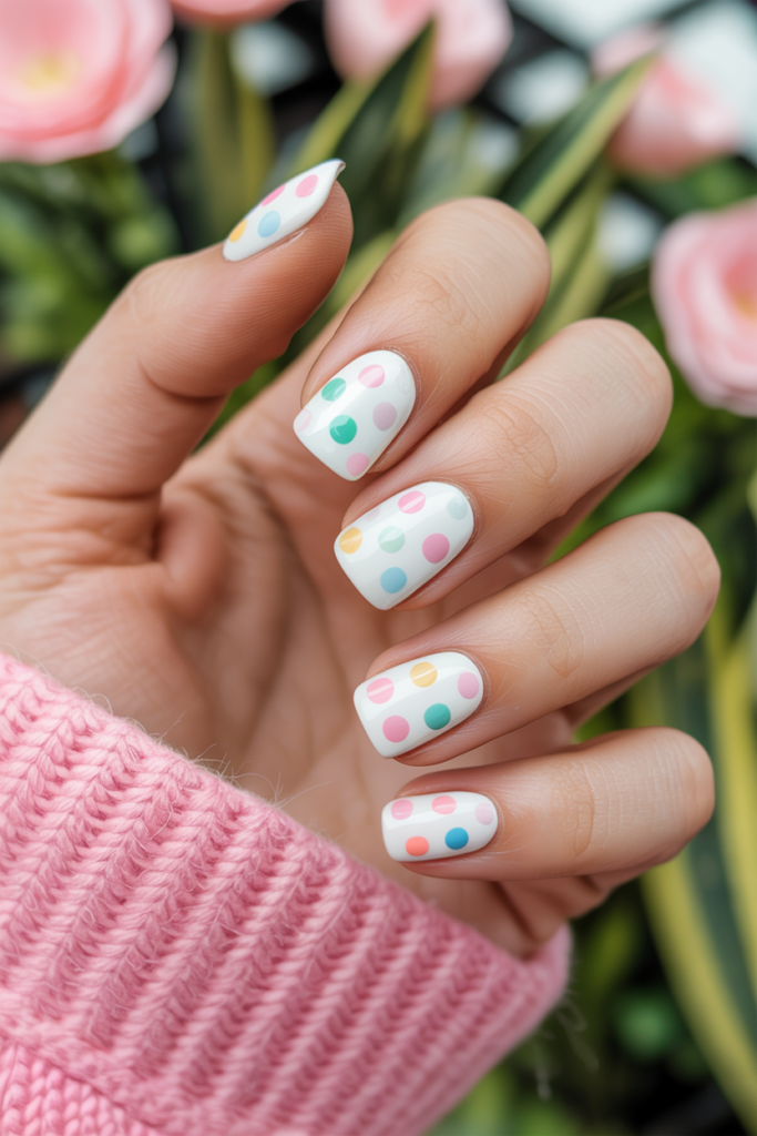 This design uses a clean white base for a fresh look. Pastel polka dots add a soft, playful touch that suits spring well. The square shape gives enough space to show the pattern clearly without being too busy. It works for both casual and formal styles.