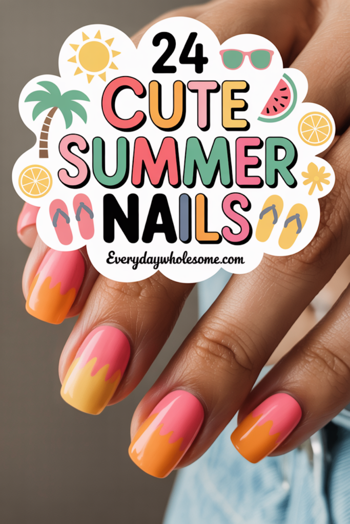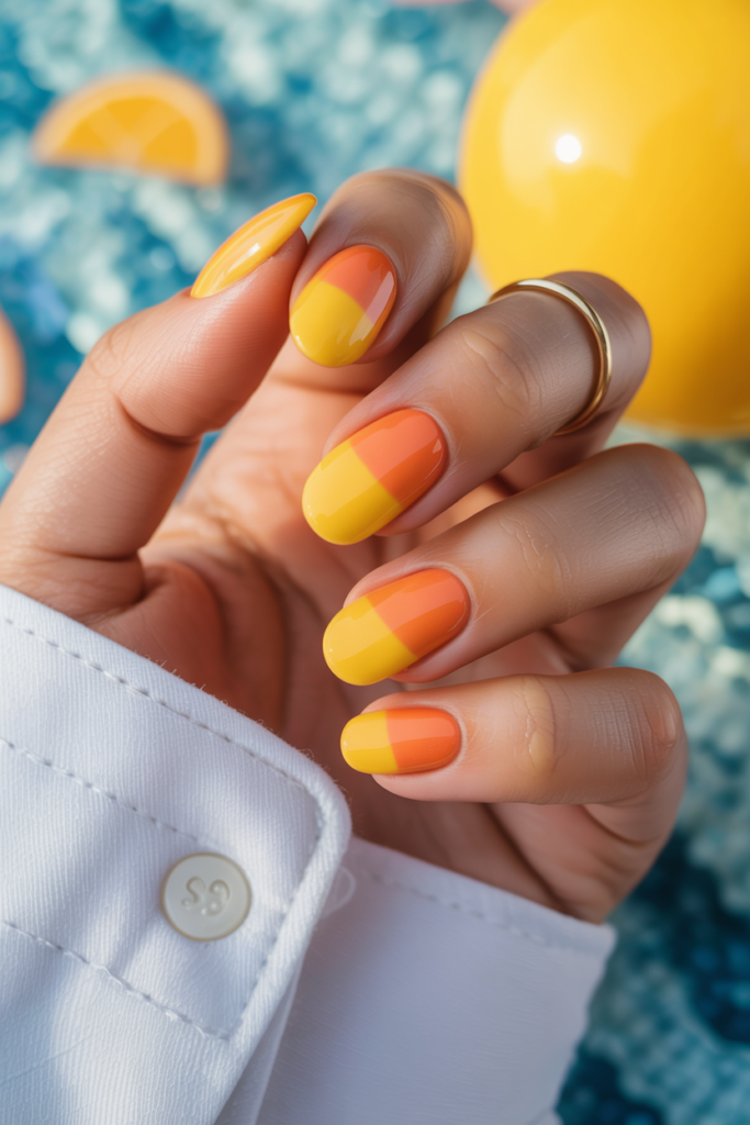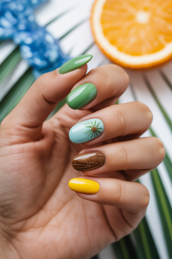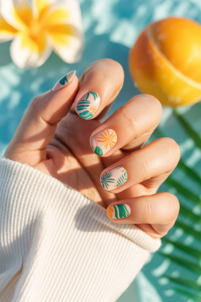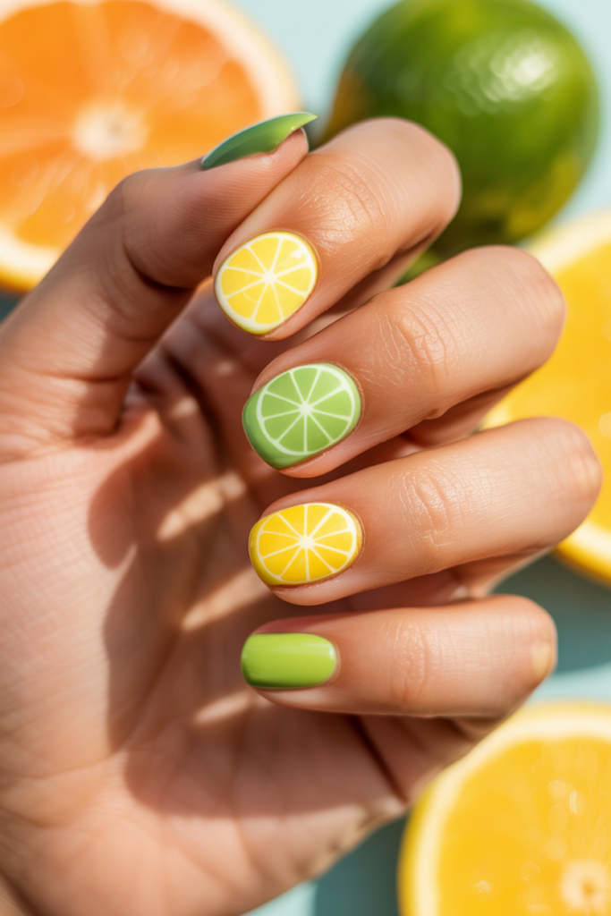 These nails often mix yellow, green, and orange shades. They fit well with vacation outfits and sunny days.