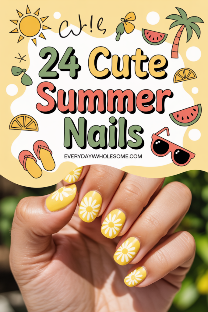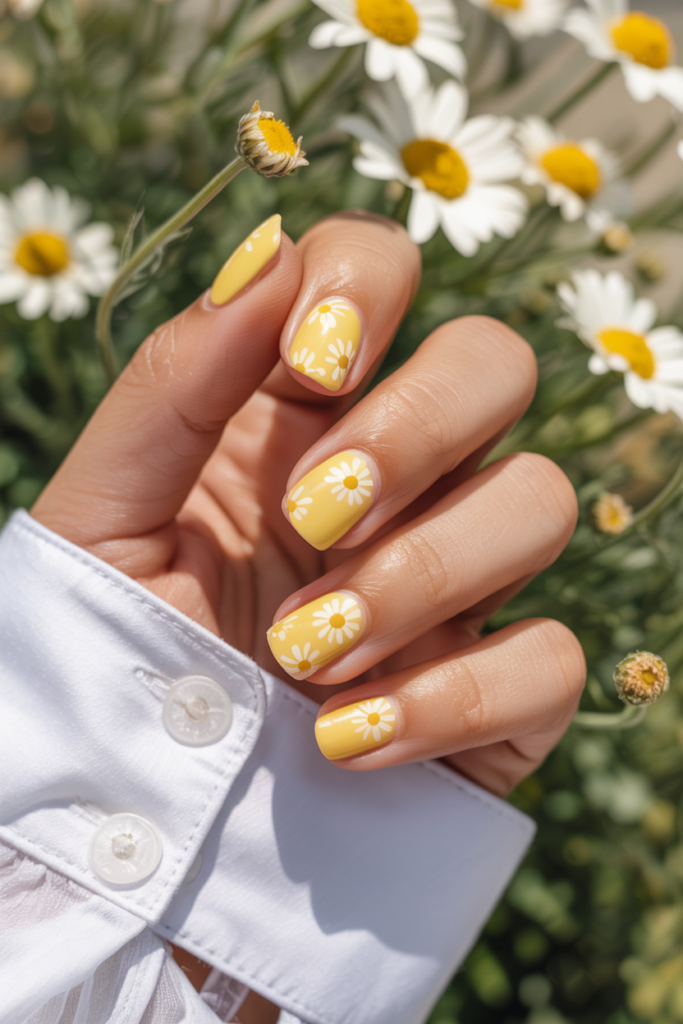 This design features soft yellow tips with small white daisy flowers. It adds a fresh and playful look without being too bold.
