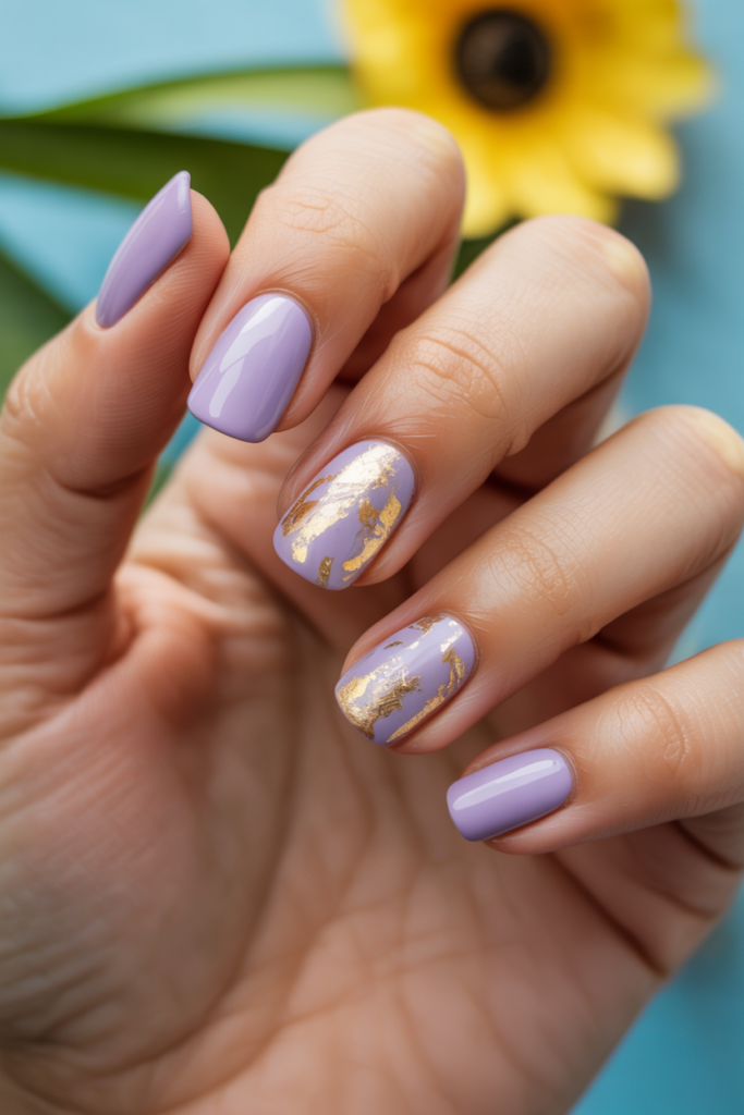 This look pairs soft lavender polish with shiny gold foil details. The gloss finish gives nails a smooth, polished surface.