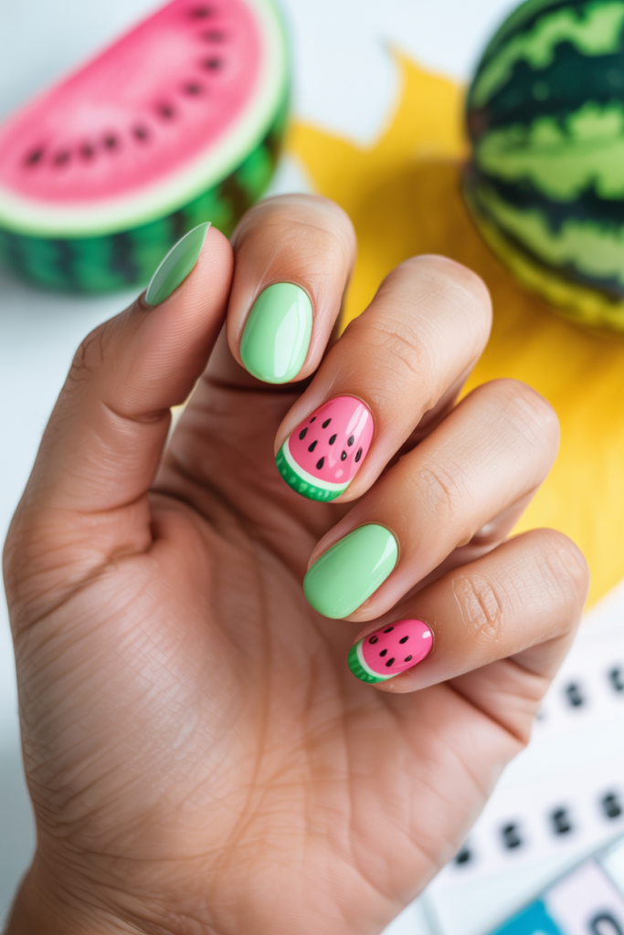 Bright watermelon slice nails use bold reds and greens for a fun, fresh look. The nails often show detailed rind and seeds for a true watermelon feel.