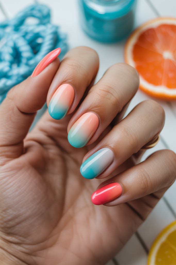 The coral and turquoise ombre combines warm and cool tones for a balanced look. The colors gently blend from coral at the nail base to turquoise tips.