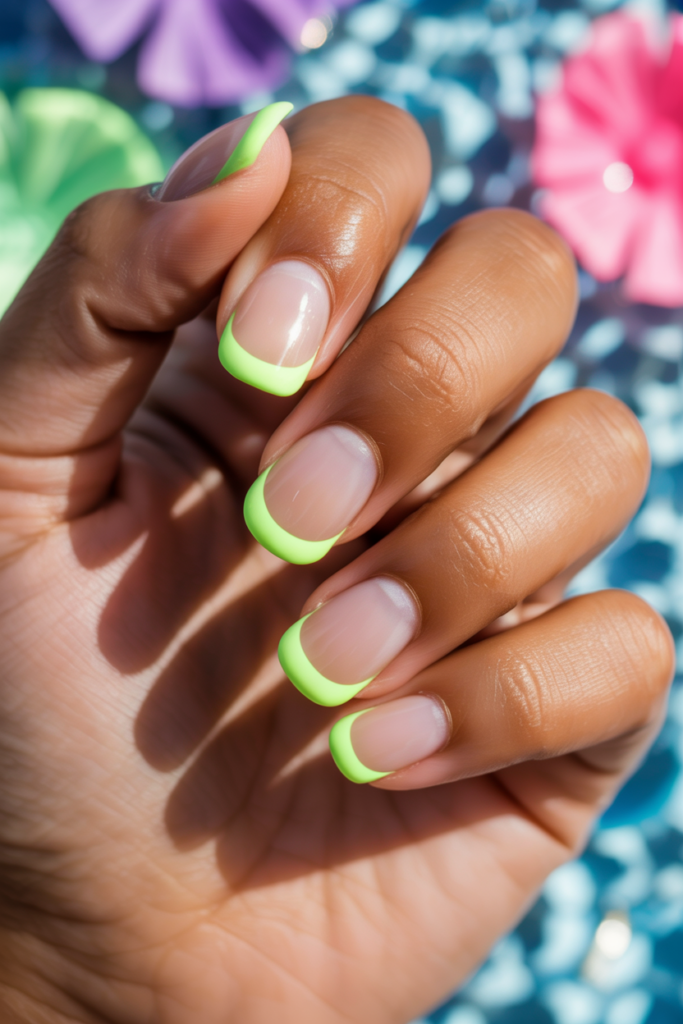 This look updates the classic French manicure by adding bright neon edges. The neon tips stand out against the natural base, creating a fresh and modern style.