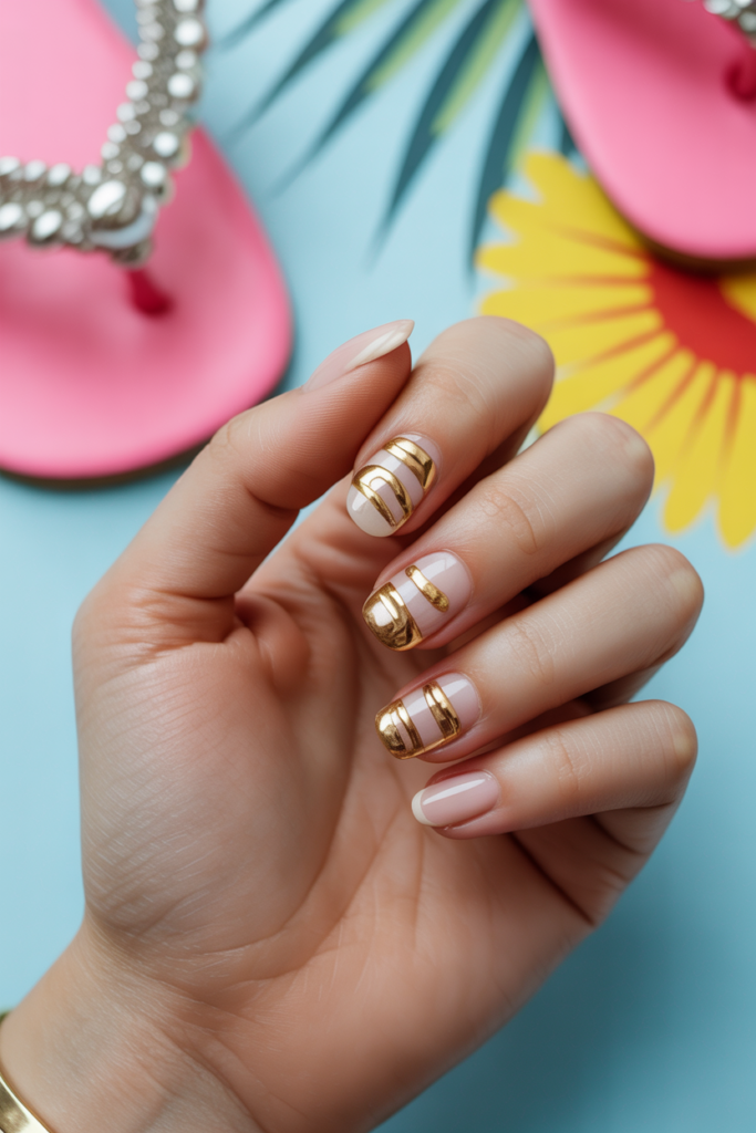 This design features shiny metallic gold nails inspired by beach sandals. The gold adds a stylish, elegant touch perfect for summer trips. It pairs well with neutral or bright colors, making it versatile for different vacation outfits. The look is simple but eye-catching for a beach vibe.