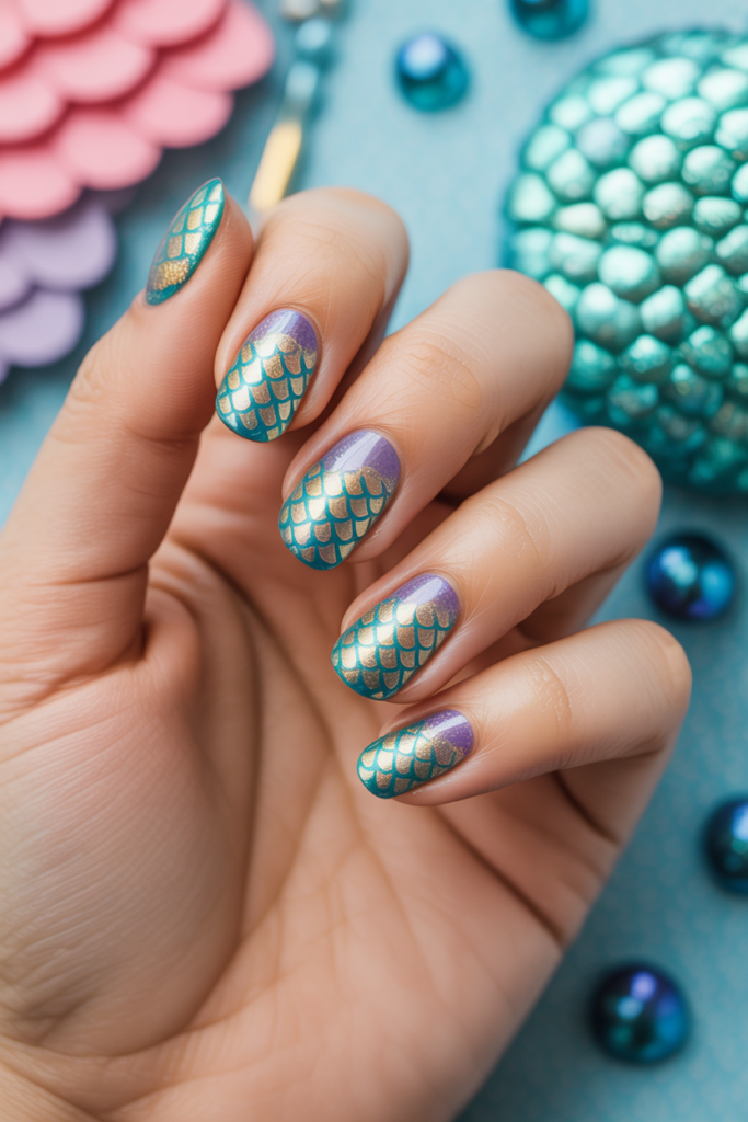 Mermaid scale shimmer nails have a unique look with overlapping scale patterns. The shimmer effect adds extra shine that catches the light in different ways.