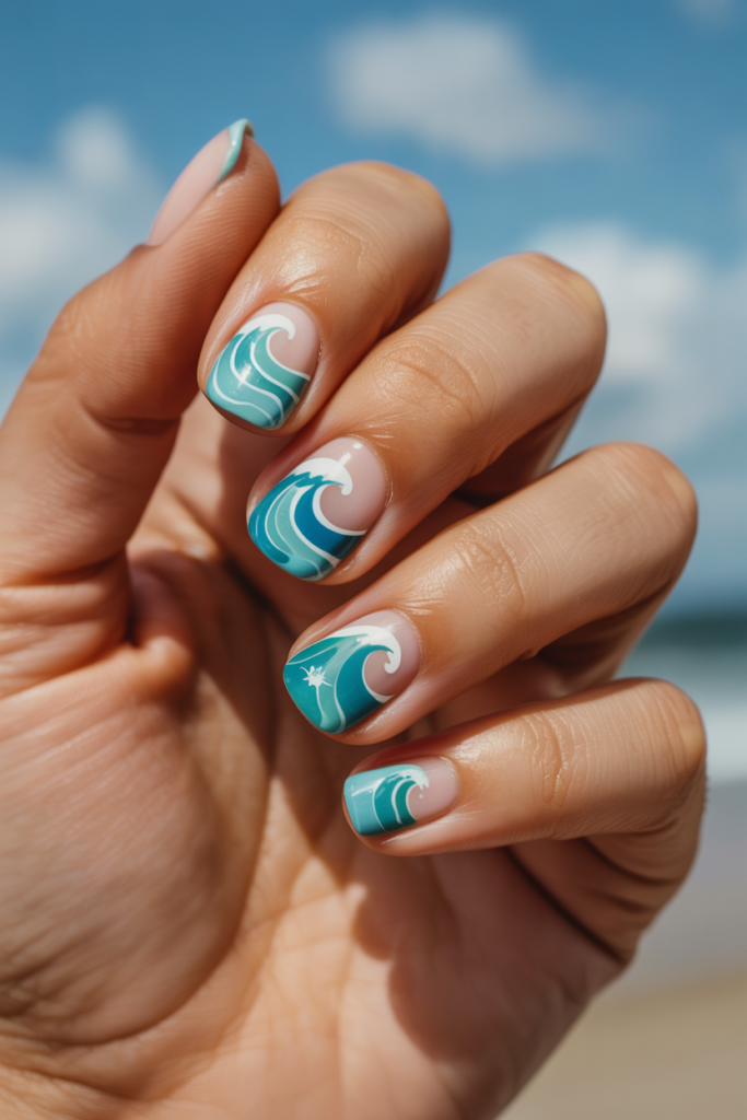 Ocean wave patterns use soft, flowing lines to mimic the movement of water. They often feature blue and white shades to create a calm, beachy feel. This design adds a simple, elegant touch that fits well with summer vacations by the sea.