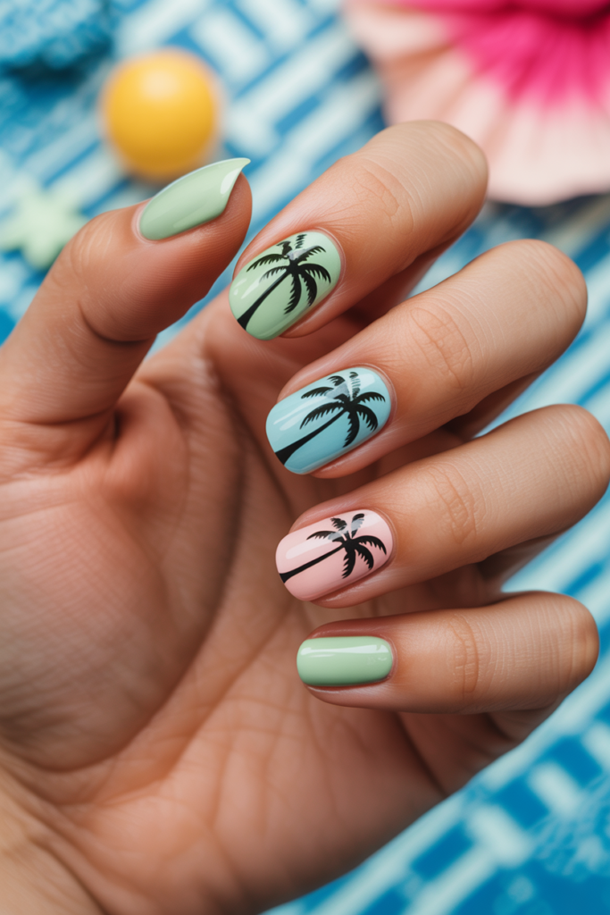 Palm tree silhouettes add a simple and stylish touch to summer nails. They work well on soft pastel or sunset gradient backgrounds.