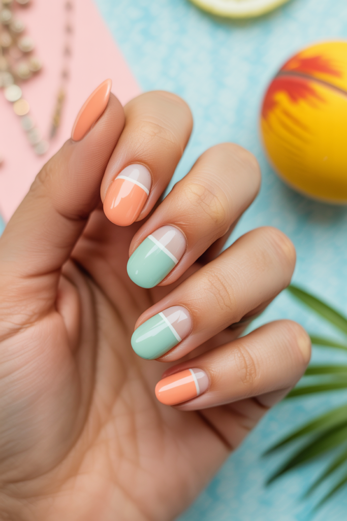 This design mixes soft peach and fresh mint shades for a calm yet stylish look. The color block style uses clean lines to separate the two colors on each nail. It gives a modern feel while staying simple and perfect for summer travel.