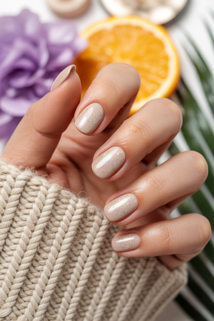 This look uses a soft beige base that mimics the color of sand. Small sparkles add a touch of shine without being too bright. It works well for a calm, beach-inspired style that fits many vacation outfits.