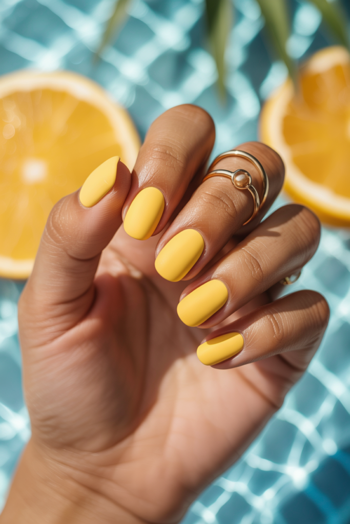 This nail look uses a soft matte yellow, perfect for summer days. It gives a modern twist to bright yellow nails without the usual shine.