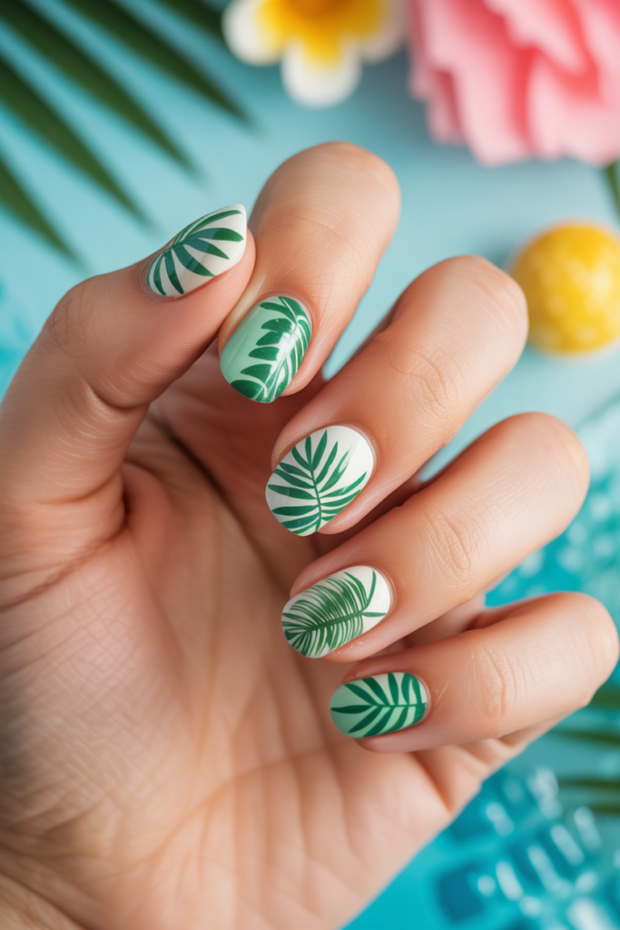 Tropical palm leaf nail art is popular for vacation looks. It features simple, green leaf shapes on bright or neutral backgrounds.