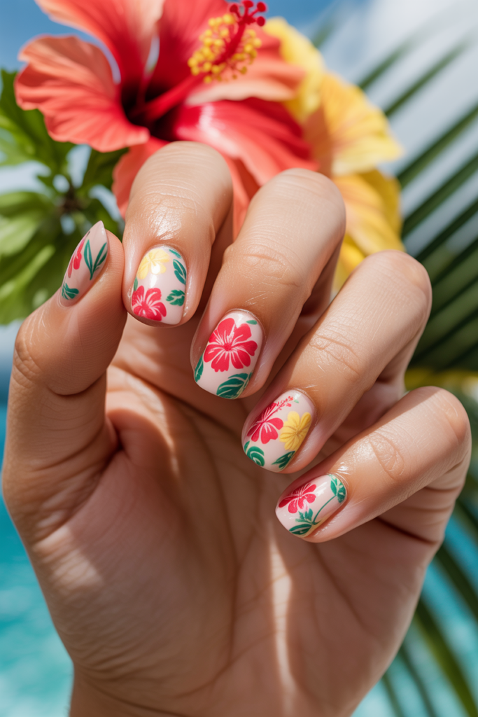 Hibiscus flower designs add a bright, tropical touch to summer nails. They bring color and energy, perfect for vacation looks.