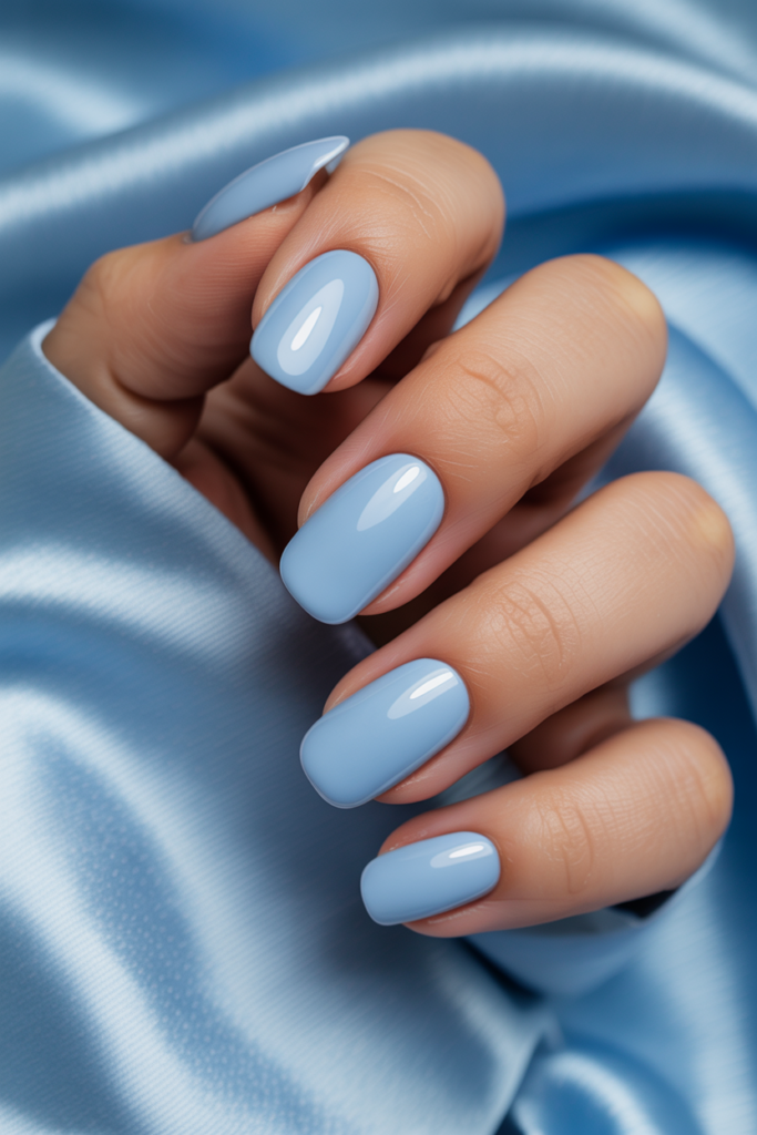 This design features a baby blue color on squoval-shaped nails. The shape blends square and oval tips for a modern look.