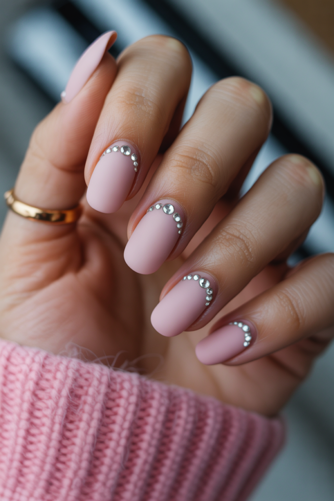 This look combines soft blush pink matte nails with a touch of sparkle. Rhinestones placed on one or two nails create a subtle highlight. The contrast between matte and shiny stones adds depth without being too bold. It suits both casual and formal styles.