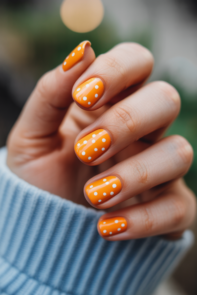This design uses a bright orange base that stands out without being too loud. Small, minimalist dots are placed carefully for a clean, modern look. It works well for anyone who wants a pop of color with simple details. The style is easy to wear and suits many occasions.