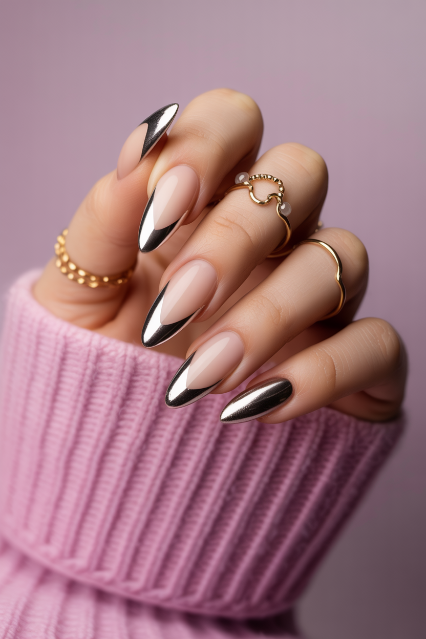 Chrome accent nails add a modern touch to almond shapes. The shiny, metallic finish works well with the elegant curves of almond nails. It creates a striking contrast that is simple but eye-catching for any season.