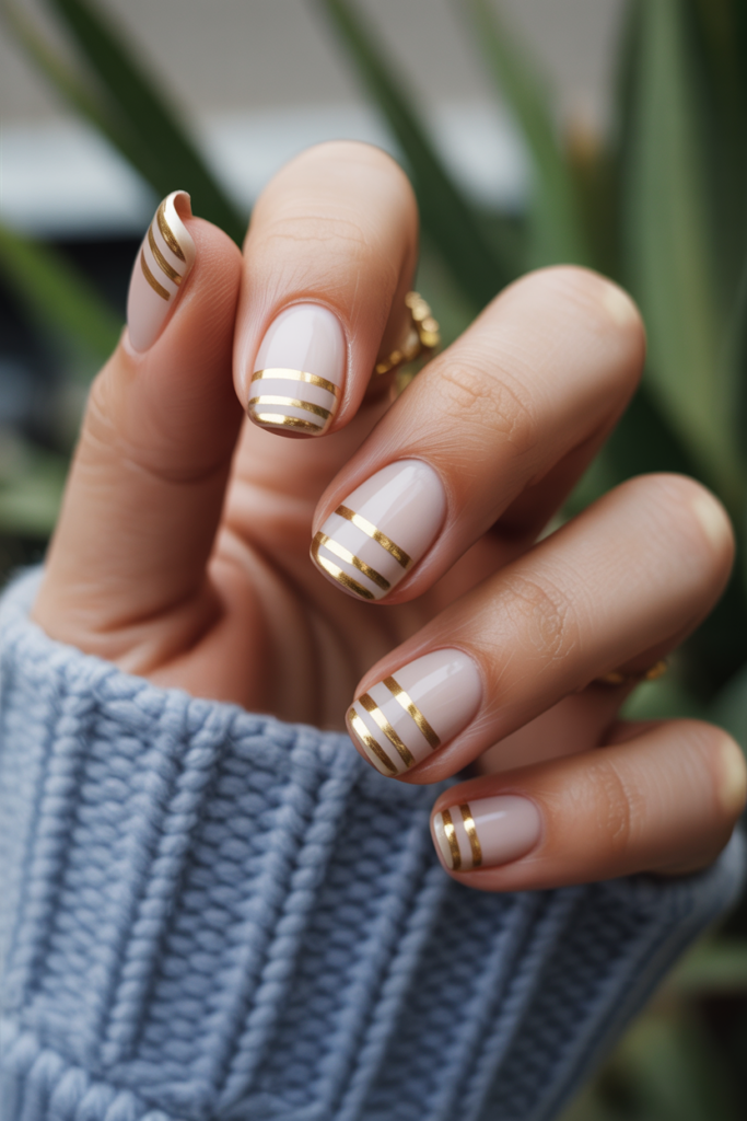This look combines a soft creamy beige base with thin gold stripes. The gold adds a subtle shine without overpowering the neutral tone. It works well for both everyday and special occasions. The design is simple but elegant, offering a modern twist on classic beige nails.