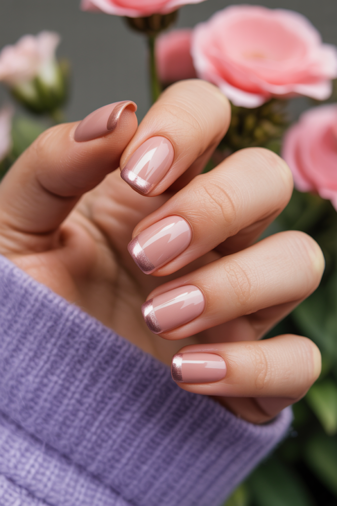 This look combines a soft dusty rose base with thin metallic tips for a modern twist. The metallic edges add a sleek shine without overpowering the muted pink. It works well for both casual and formal occasions. The style feels elegant and simple.