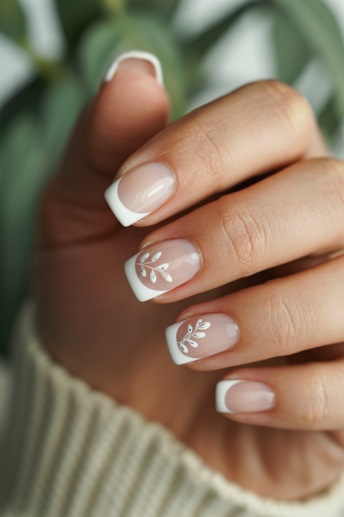 This design adds small leaf shapes to the classic French tips. It gives the nails a soft, natural look fitting for spring.