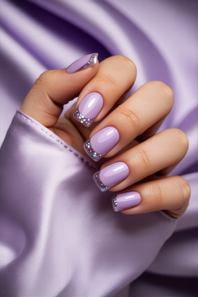 Glossy lilac nails create a shiny and smooth base that looks fresh for spring. Adding silver glitter accents gives the nails a subtle sparkle without being too bold. This combination balances softness and shine, making it suitable for both casual and dressy occasions.