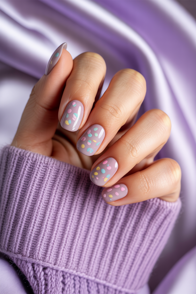 This style pairs a shiny mauve base with small, colorful confetti dots. The gloss finish adds a smooth, polished look.
