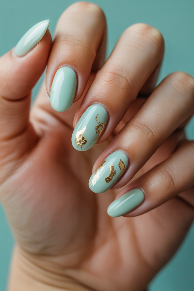 Light mint green nails paired with gold foil create a fresh and polished look. The soft, cool base gives a subtle vibe.