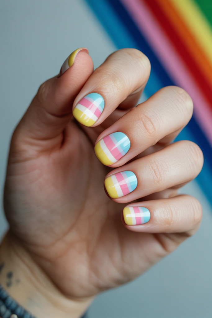 Pastel rainbow stripes add a soft, colorful touch to short nails. The light, muted colors work well with a variety of skin tones.