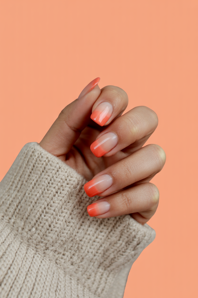 Peachy coral gradient tips blend soft peach tones with vibrant coral shades. This style creates a smooth color fade on the nails, adding subtle depth without being too bold.