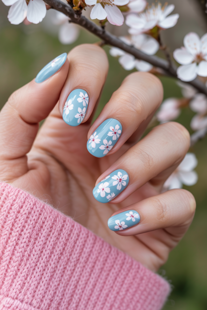 This design uses a soft sky blue base that feels fresh and calm. Hand-painted cherry blossoms add a delicate, artistic touch.