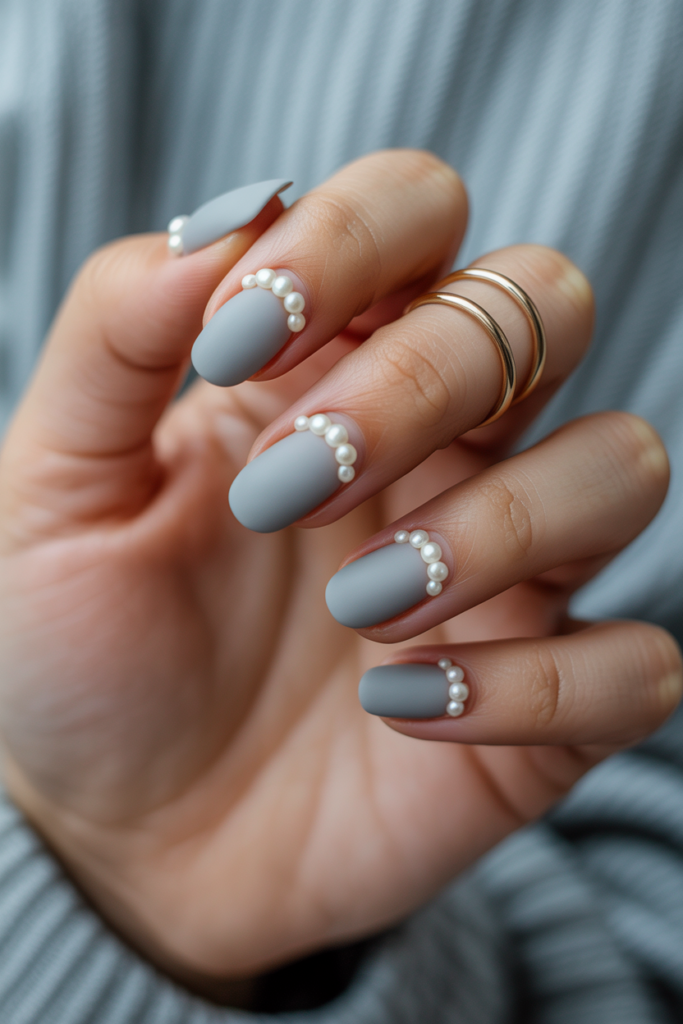 This design combines a soft grey matte base with subtle pearl details. The matte finish gives a smooth, modern look. Pearl accents add a touch of elegance without being too bright or flashy. It works well for both casual and formal styles.
