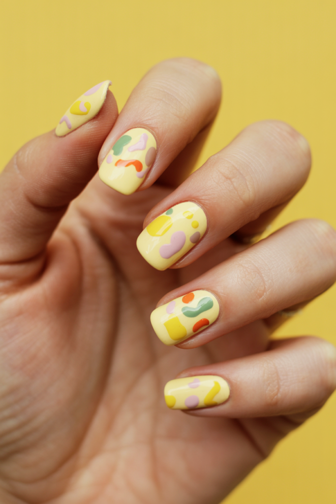 The pattern is easy to create with simple tools like a dotting tool or bobby pin. It suits short or medium nails well.