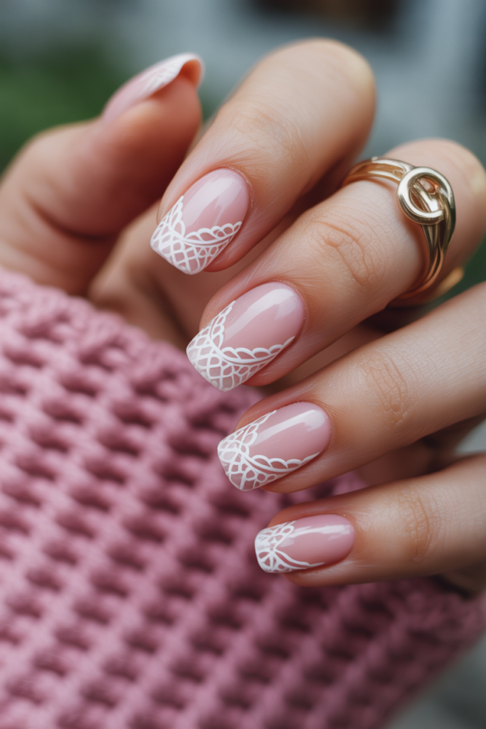 This look uses a soft, see-through pink base for a delicate effect. White lace patterns add a vintage touch that feels light and elegant.