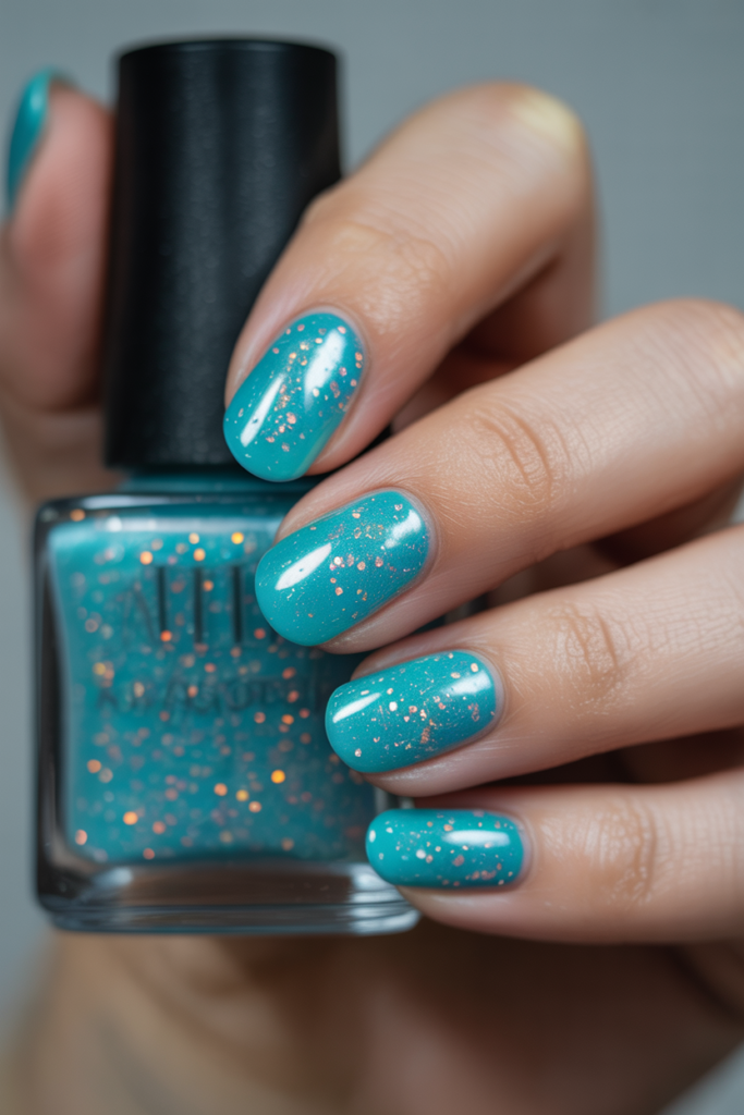 Turquoise nails with a fine glitter overlay offer a subtle shimmer that enhances the base color. The glitter adds a soft sparkle without overpowering the turquoise shade. This look works well for both casual and dressy occasions, giving nails a fresh, polished feel.