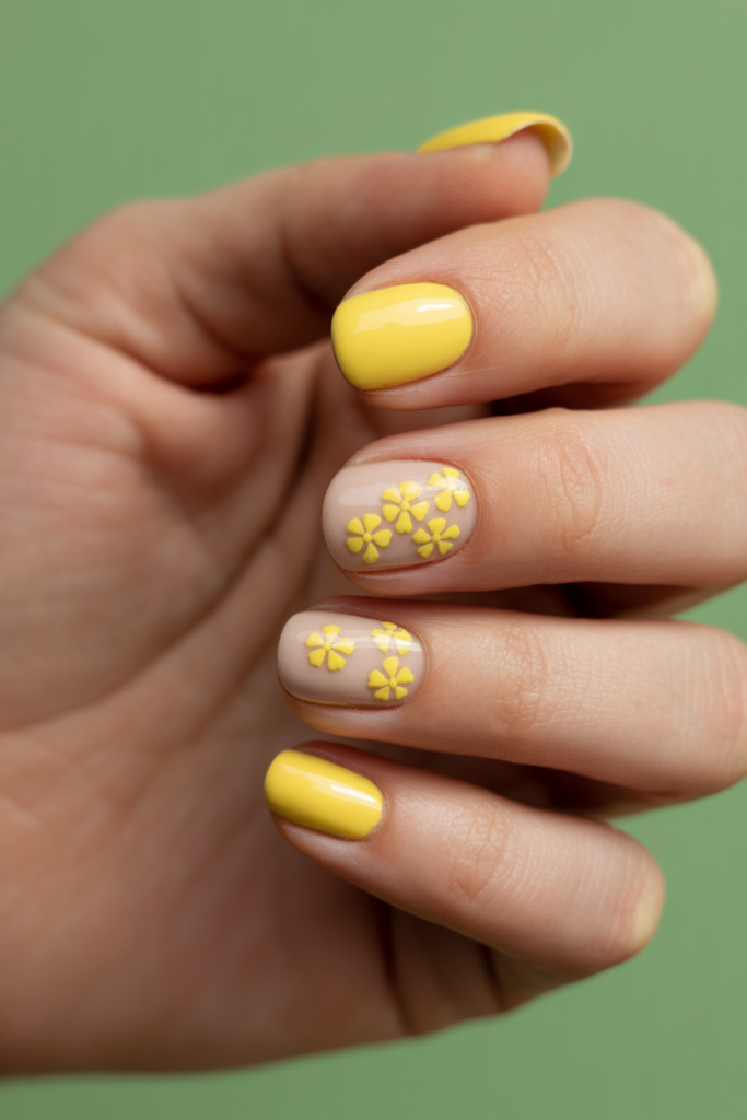 This design features a soft yellow base with small buttercup flower accents. The tiny flowers add a delicate and fresh look. It works well for spring and pairs easily with many skin tones. The style is simple but stylish.