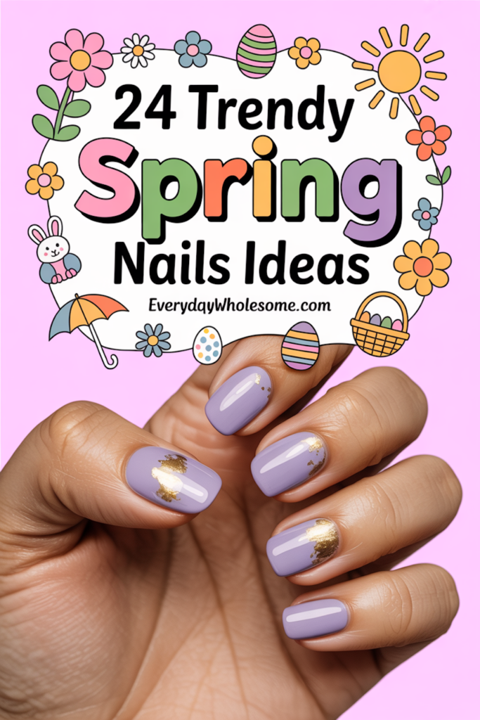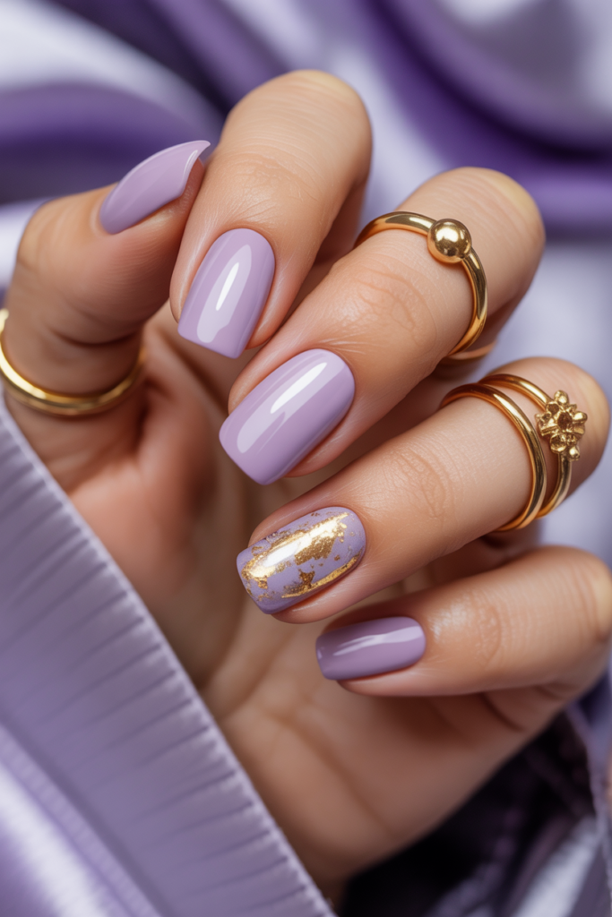 This look pairs soft lilac polish with shiny gold foil accents. It creates a chic contrast that feels fresh for spring.