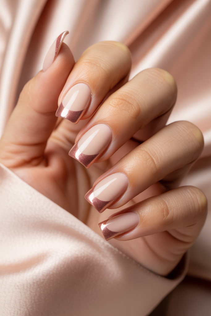 This nail design pairs creamy beige with a soft rose gold shimmer for a subtle yet stylish look. It works well for both casual and formal occasions.