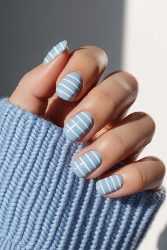 This design blends soft baby blue with clean white stripes for a fresh, simple look. It suits both short and long nails, offering a neat, modern style.