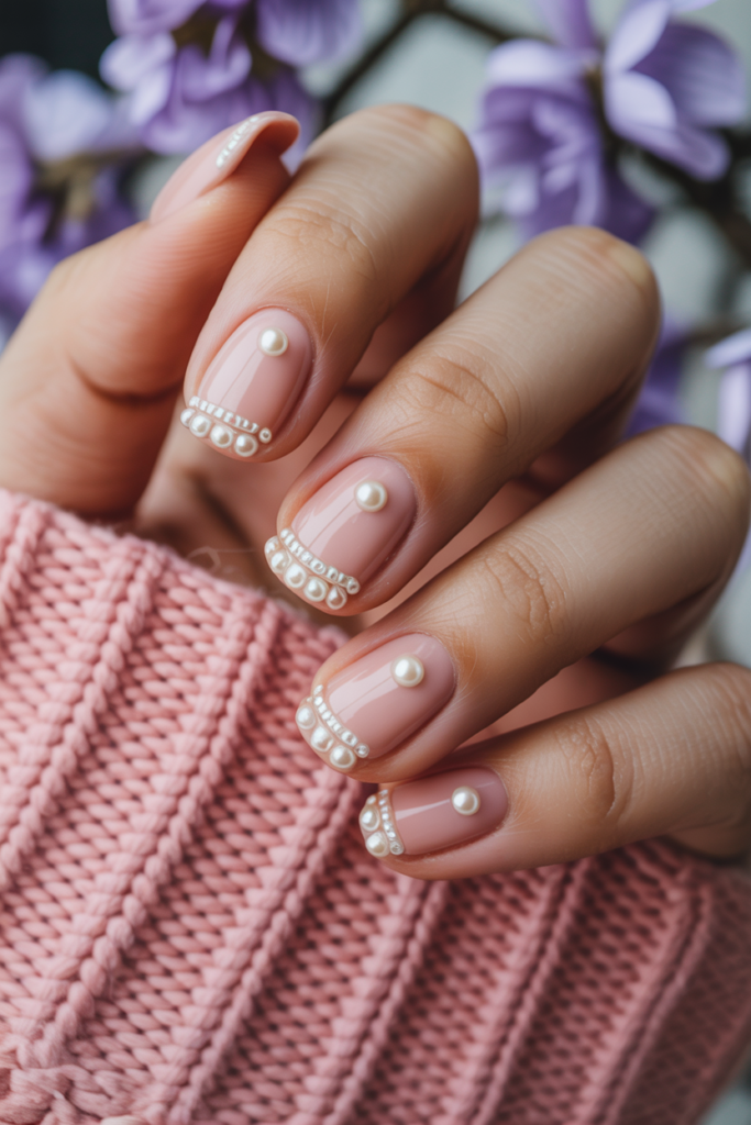 Blush pink nails offer a soft, romantic look perfect for spring. Adding tiny pearl accents creates a delicate, elegant touch.