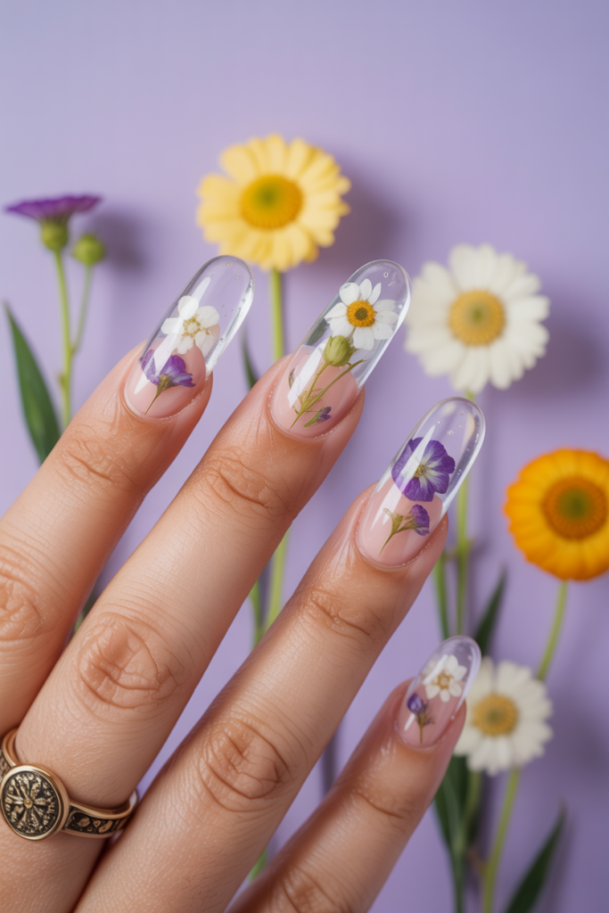 Clear nails with pressed flowers offer a delicate and natural look. The flowers are carefully placed inside a clear acrylic or gel base, creating an elegant design. This style works well with soft pastel tones or a simple transparent finish for a fresh spring feel.
